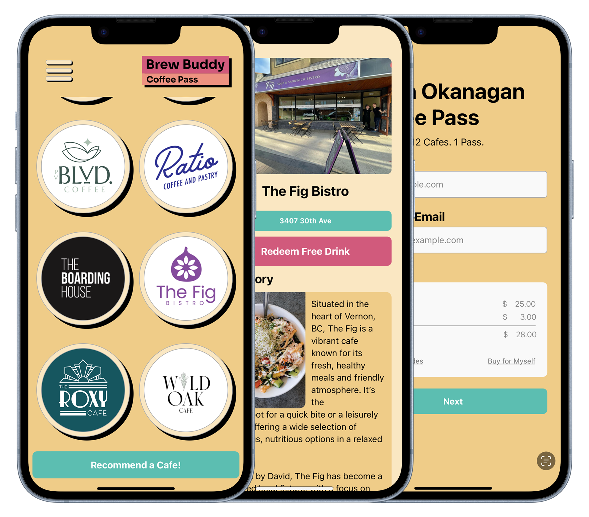Head to each of the cafes. When you arrive, look for the Brew Buddy QR code. Scan it with the pass and show the barista.